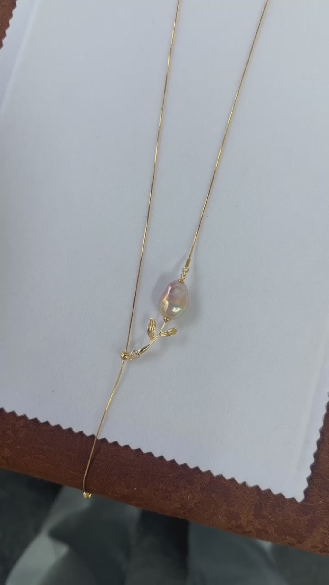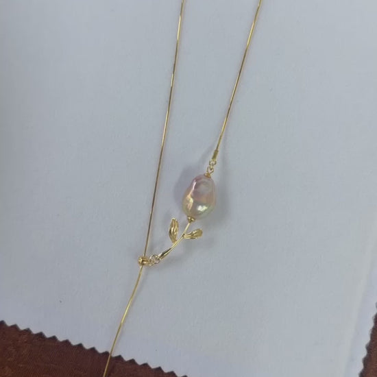 This piece feels like sunlight captured in jewelry form: an iridescent baroque pearl cradled by 18K gold vermeil leaves, resting on a slender pull-through chain.